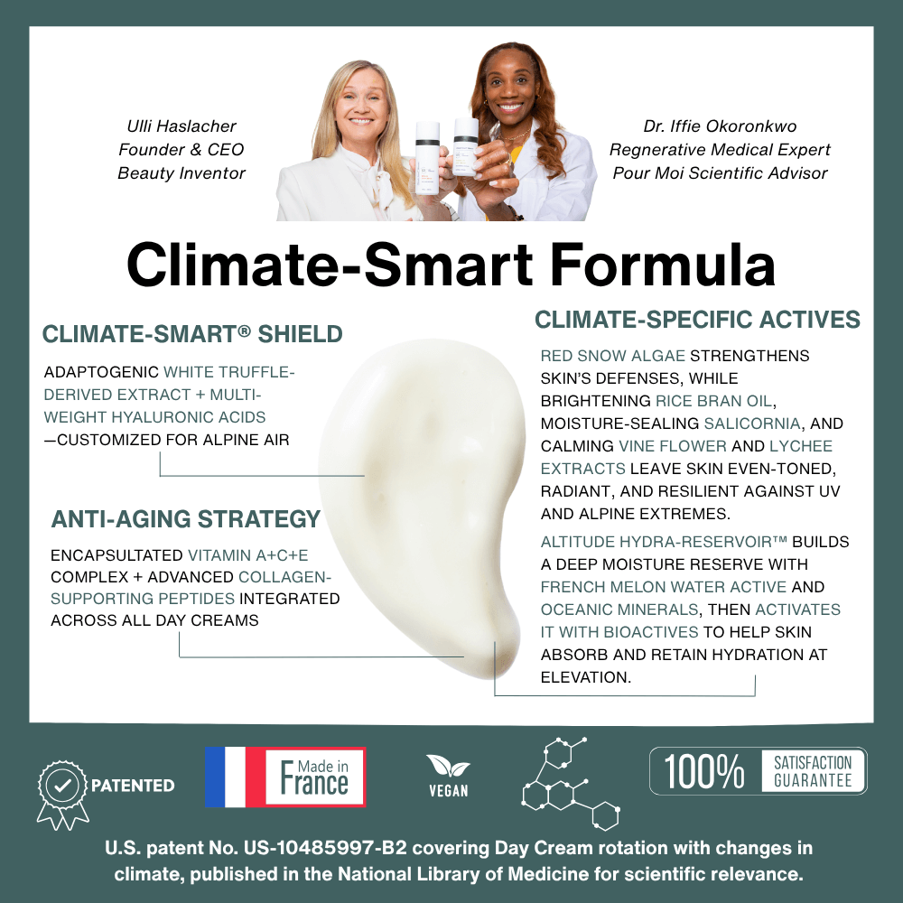 No matter the climate - or man-made environmental cause, once free radicals form, their only goal is to damage the proteins, lipids, and DNA in your cells. The visible signs of this process are fine lines, wrinkles and dark spots. And the only line of defense is antioxidants, the star of which is vitamin C. It neutralizes the harmful free radicals and literally puts the brakes on the cascade of damage that’s about to occur. In fact, one study found that people who applied topical vitamin C to their face for just 12 weeks showed a reduction in wrinkles and fine lines. Another found that volunteers with photo-damaged skin showed significant improvement in skin texture, wrinkling, skin tone, and sallowness during the same time frame. So if you want to slow—even reverse—the signs of climate-induced skin aging, don’t skimp on the C. Utilize an antioxidant-packed serum twice a day. Choose Pour Moi’s White Serum if your skin is oily to normal, or Black Serum for dry skin. Follow with a day cream that matches your unique climates needs, Tropical Day Cream for hot, humid environments, Desert Day Cream for hot, dry climates, and Polar Day Cream for frigid, dry weather. All contain healthy doses of vitamin C to protect skin from free radicals caused by UV rays, pollution, and other environmental aggressors. When used in a 3-step skincare ritual, Vitamin C gives skin the chance it needs to smooth out fine lines and wrinkles, firm and brighten skin’s overall tone and fend off climate related environmental aggressors. That’s the Pour Moi difference.